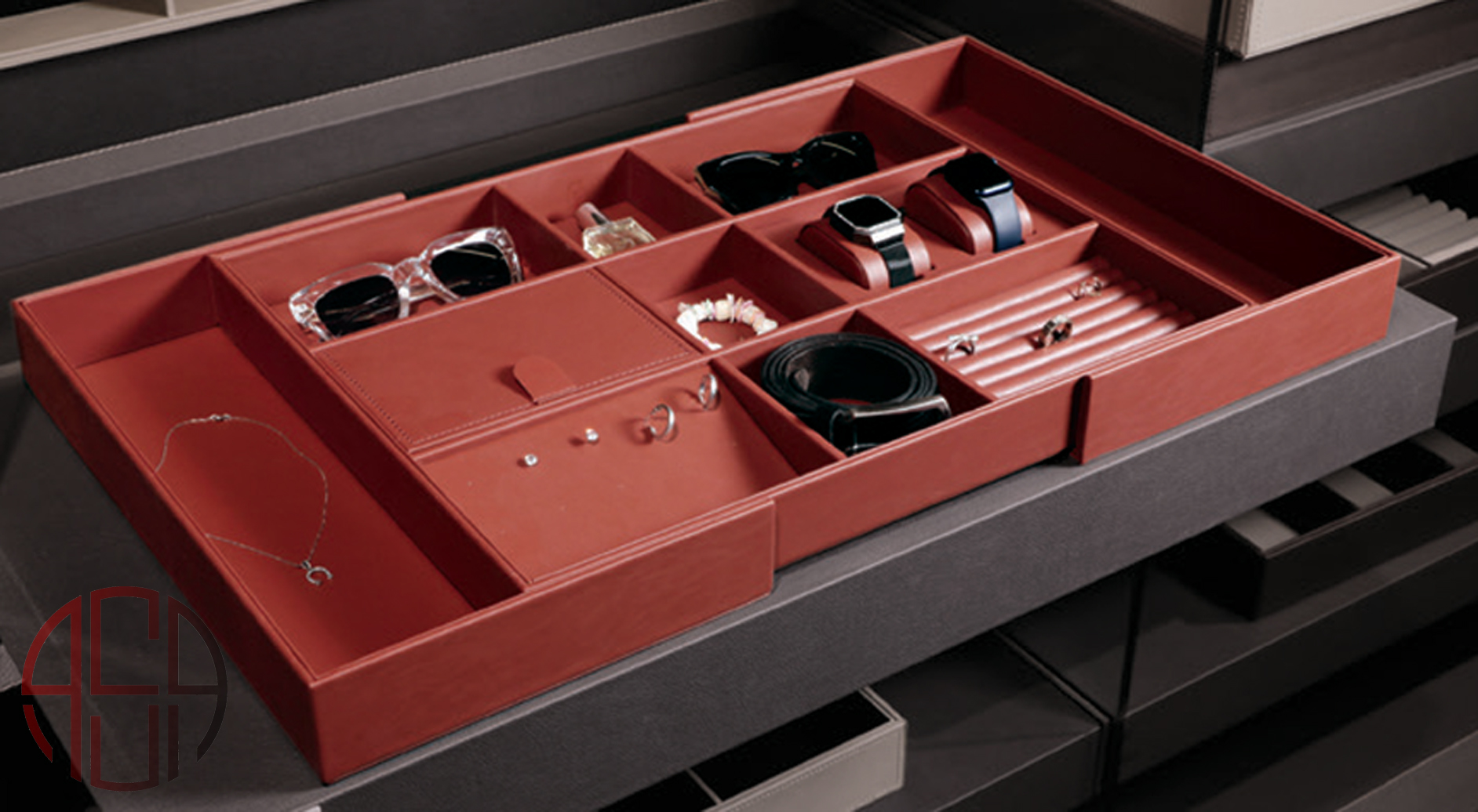 این باکس چرمی با طراحی منحصر به فرد و کیفیت بالا، گزینه ای ایدهآل برای نگهداری و مرتب سازی اقلامی مانند زیورآلات و کمربند ها می باشد. استفاده از این کشو در کنار سایر نظم دهنده کمد دیواری مانند رگال شلوار، به شما این امکان را می دهد تا فضای داخلی کمد خود را به بهترین شکل مدیریت کنید و از آن به صورت بهینه استفاده نمایید. این محصول با قابلیت تغییر سایز، امکان شخصی سازی فضای داخلی کمد را فراهم می کند.