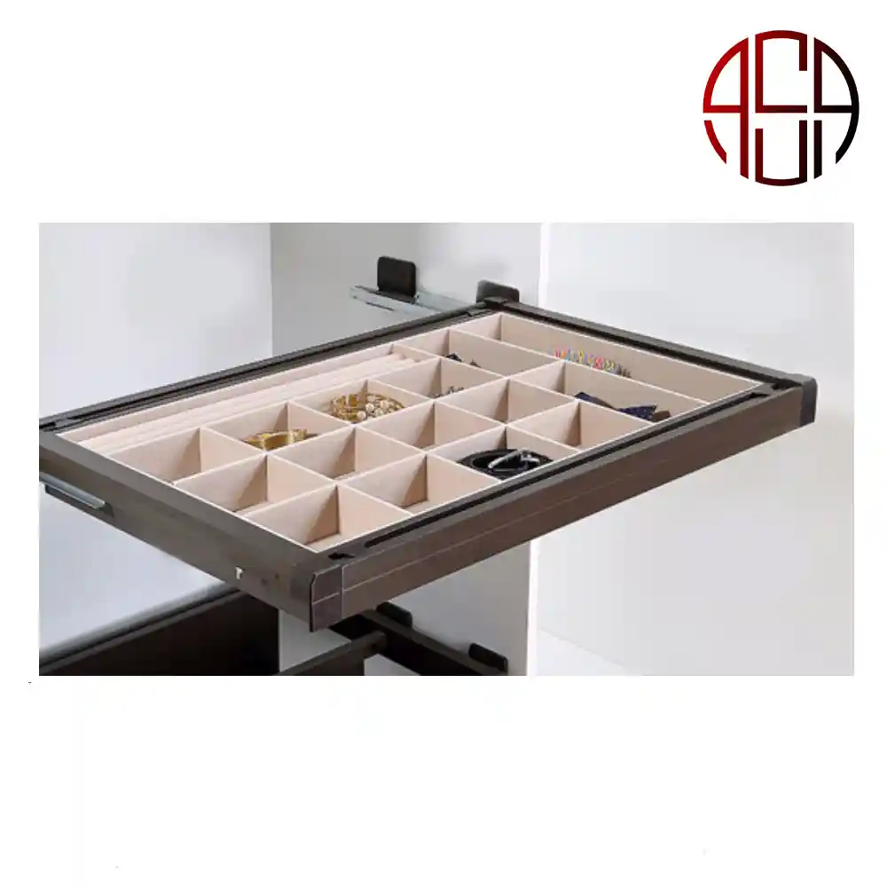 این نظم دهنده اکسسوری بهصورت ریلی طراحی شده و دارای باکسهای تقسیمبندی شده کوچک و بزرگ است تا بتوانید زیورآلات، ساعت، انگشتر، گردنبند، دستبند، کراوات، کمربند و سایر اکسسوریهای شخصی را به شکلی کاملاً منظم و دستهبندی شده در آن قرار دهید. این طراحی هوشمندانه علاوه بر جلوگیری از گمشدن یا آسیب دیدن لوازم، باعث صرفهجویی در زمان هنگام انتخاب اکسسوری نیز میشود.