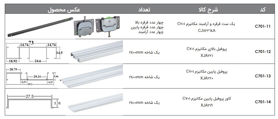 مکانیزم درب ریلی تاپ لاین توکار با آرامبند 2400mm دو درب فانتونی کد C701