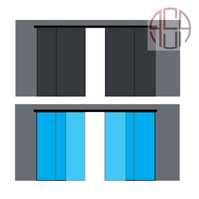 مکانیزم روف هنگ 6000mm دو درب متحرک دو درب ثابت با پروفیل آلومینیوم دو جداره ساختمانی متقارن برقی سینکرونایز فانتونی کد K189: عرض درب 1200mm-1100mm و ضخامت درب 8mm
