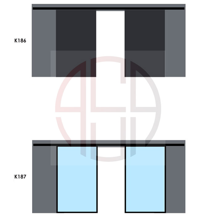 مکانیزم وال هنگ 5400mm دو درب پروفیل آلومینیومی دو جداره شیشه ساختمانی متقارن برقی سینکرونایز فانتونی کد K187: با عرض درب 1100-1200 میلیمتر و ضخامت شیشه 8 میلیمتر