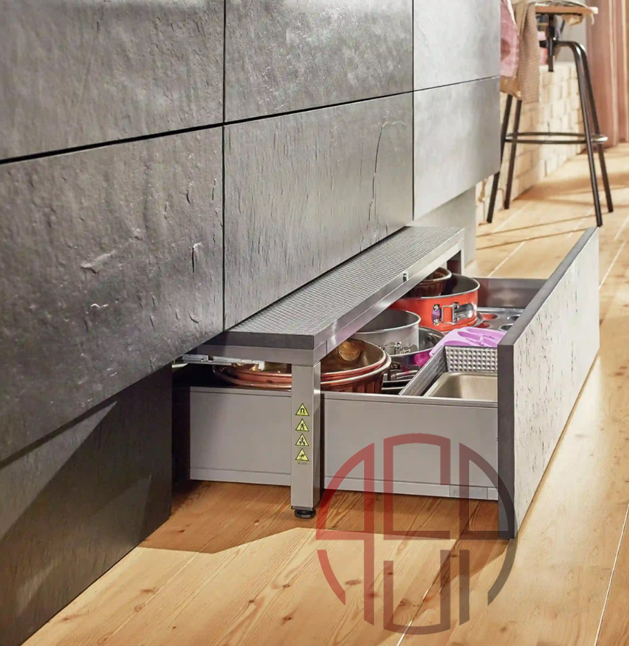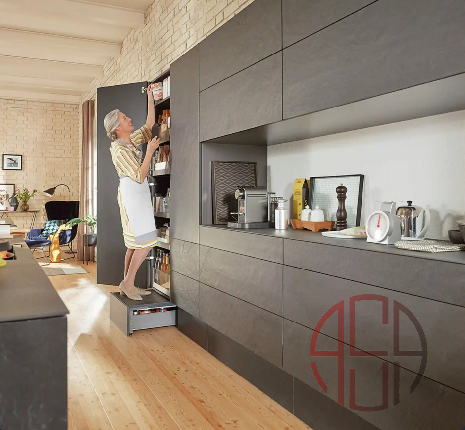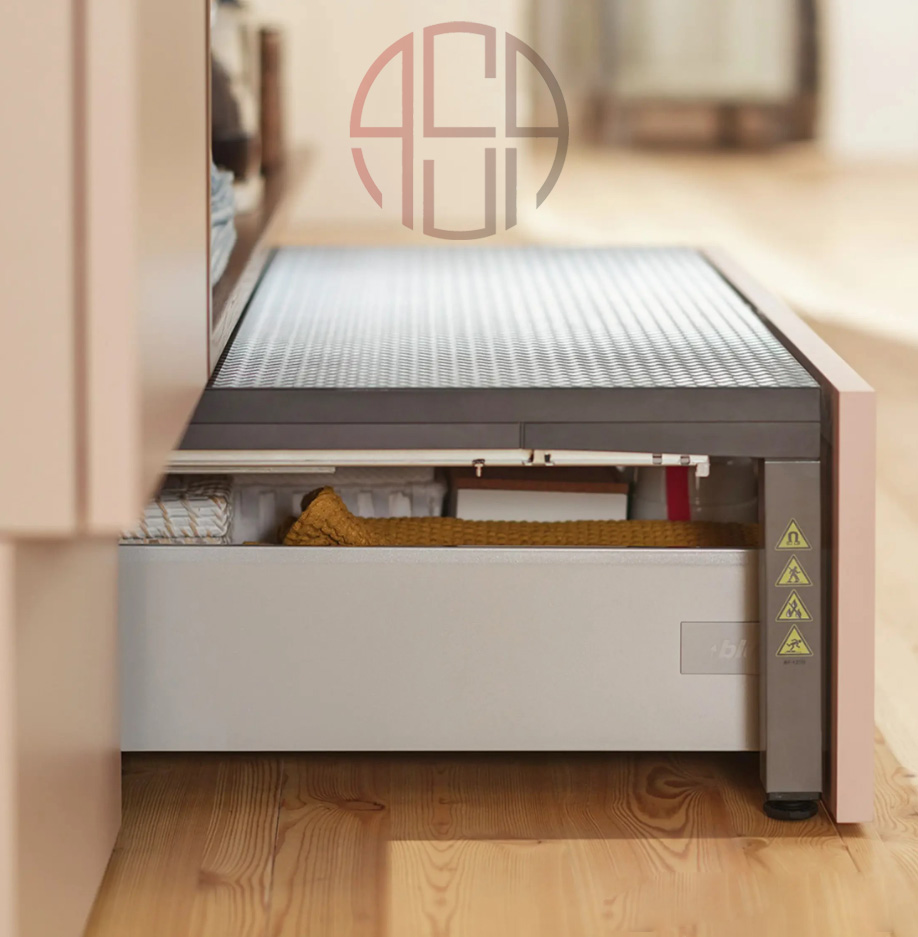 SPACE STEP (پله فضایی) بلوم به شما کمک میکند تا فضای بیشتری برای ذخیرهسازی وسایل خود در قسمتهای مختلف، از جمله آشپزخانه، اتاقخواب، سرویس بهداشتی و … داشته باشید. این مدل میتواند به عنوان پله برای دسترسی راحتتر شما به کابینتهای بالایی استفاده شود. به لطف فناوریهای حرکتی توسط بلوم، SPACE STEP به راحتی باز وبسته میشود، سیستم سروودرایو، باعث میشود که با کوچکترین لمس درب کابینت باز شود و توسط سیستم BLUMOTION (آرامبند) به آرامی بسته شود.سیستم ضد لغزش این محصول، با وزن 8 کیلوگرم فعال میشود و آن را در موقعیت خود قفل میکند.